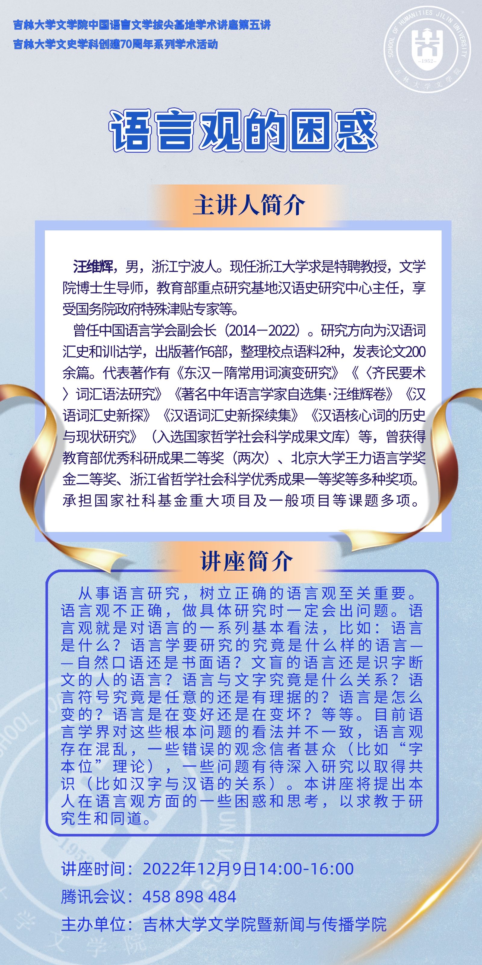 主讲人简介:汪维辉,男,浙江宁波人。现任浙江大学求是特聘教授,必赢(中国)biying·官方网页版博士生导师,教育部重点研究基地汉语史研究中心主任,享受国务院政府特殊津贴专家。曾任中国语言学会副会长(2014-2022)。研究方向为汉语词汇史和训诂学,出版著作6部,整理校点语料2种,发表论文200余篇。代表著作有《东汉-隋常用词演变研究》《〈齐民要术〉词汇语法研究》《著名中年语言学家自选集·汪维辉卷》《汉语词汇史新探》《汉语词汇史新探续集》《汉语核心词的历史与现状研究》(入选国家哲学社会科学成果文库)等,曾获得教育部优秀科研成果二等奖(两次)、北京大学王力语言学奖金二等奖、浙江省哲学社会科学优秀成果一等奖等多种奖项。承担国家社科基金重大项目及一般项目等课题多项。