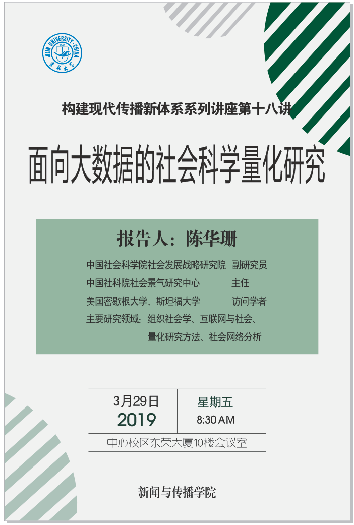 作者简介:陈华珊,中国社会科学院社会发展战略研究院副研究员、中国社科院社会景气研究中心主任,曾先后作为美国密歇根大学、斯坦福大学访问学者。目前主要从事基于大数据的社会学实证研究,主要研究领域为:组织社会学、互联网与社会、量化研究方法、社会网络分析,主持包括国家社科基金在内的多项大数据相关实证研究课题。