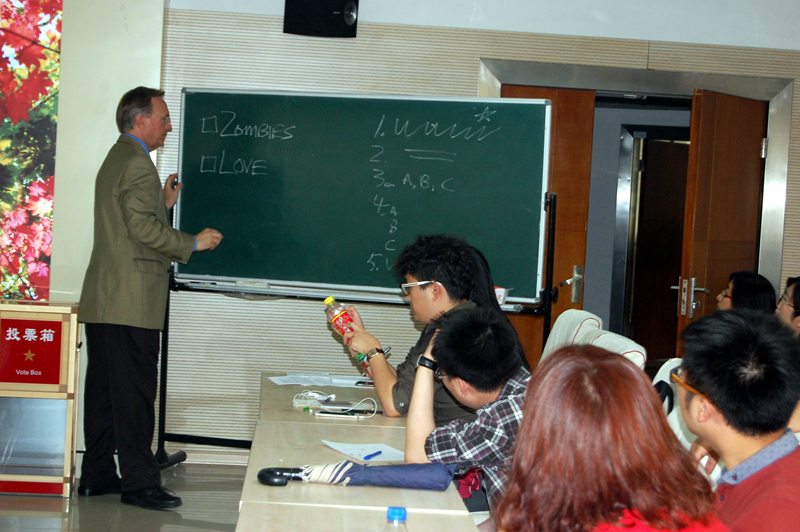 5月26日下午,美国肯塔基大学布克•莱恩(Buck Ryan)副教授给必赢(中国)biying·官方网页版暨新闻与传播学院的40多名师生作了一场题为《大师理念指导下的故事讲述:探索中国的艺术与文化》的讲座,布克•莱恩先生介绍了如何运用他所创立的“大师理念”(Maestro Concept)来讲故事。他首先展示了我院一名硕士研究生在肯塔基大学交流学习过程中对美国社会及文化认识的变化,然后布克•莱恩先生通过圣帕特里克节讲解了中美文化的差异,在圣帕特里克节这一天如果有人戴绿帽子,这是很正常的,但在中国“绿帽子”却有着其他的含义。讲座中还播放了“大师理念”(Maestro Concept)录像片断。在互动环节,布克•莱恩先生给出一个关键词,设定一个主题情景,将听讲师生分成小组,让每个小组为主题情景编写一段小故事,如Zombies(僵尸)、Love(爱)、Funeral(葬礼)等,听讲师生都积极地参与并踊跃发言,讲述自己小组创作的小故事,故事或新奇搞笑,或跌宕起伏,现场气氛十分活跃。通过互动,使师生了解到如何充分理解中美两国之间的文化差异,更好地讲好故事、做好有效传播的工作要领。