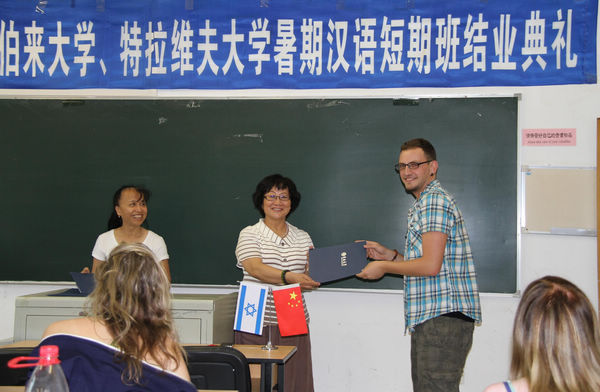 结业典礼上,吉林大学国际语言学院副院长刘富华教授为全体学员颁发了结业证书并致辞,刘富华在致辞中高度赞扬了全体学员认真刻苦的学习精神,对学员们在汉语方面取得的进步给予了充分肯定,并希望他们以后继续努力,为中以两国的友好不断努力。希伯来大学和特拉维夫大学领队林倩老师用了八个感谢表达了她对吉林大学的深深感激,她说“感谢吉林大学,感谢国际语言学院,感谢刘富华副院长,感谢五位任课老师,感谢两位助教老师,感谢国际合作与交流处,感谢国际语言学院办公室,感谢所有人给她们提供的方方面面的照顾和帮助”,并希望双方进一步加强合作。学员安东代表希伯来大学表达了希伯来大学对吉林大学的情意,并表示以后一定会努力学习汉语,为中以友好贡献自己的力量。最后学员们用他们自谱自写的歌曲表达了他们对吉林大学的深情厚谊,歌中唱到“我们来到了中国,什么都不明白。听了太多的生词,我学不过来。到了教室的时候,别提多紧张了,…………六个星期以后,我们什么都明白。看中文电影字幕,我们都明白。多亏你的帮助,很聪明的老师。我们感谢你的带路,祝你们快乐。……”充满深情的歌声将结业典礼推向高潮。