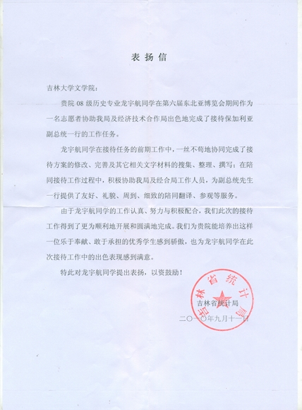 龙宇航同学在接待任务的前期工作中,一丝不苟地协同完成了接待方案的修改、完善及其它相关文字材料的搜集、整理、撰写;在陪同接待工作过程中,积极协助我局及经合局工作人员,为副总统先生一行提供了友好、礼貌、周到、细致的陪同翻译、参观等服务。