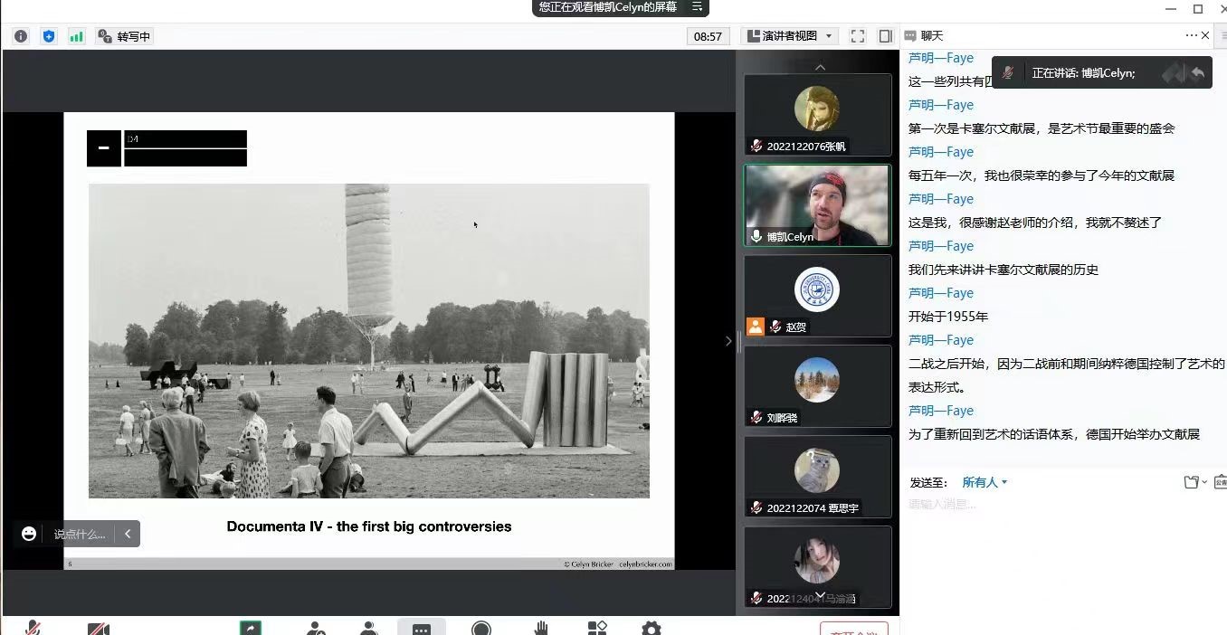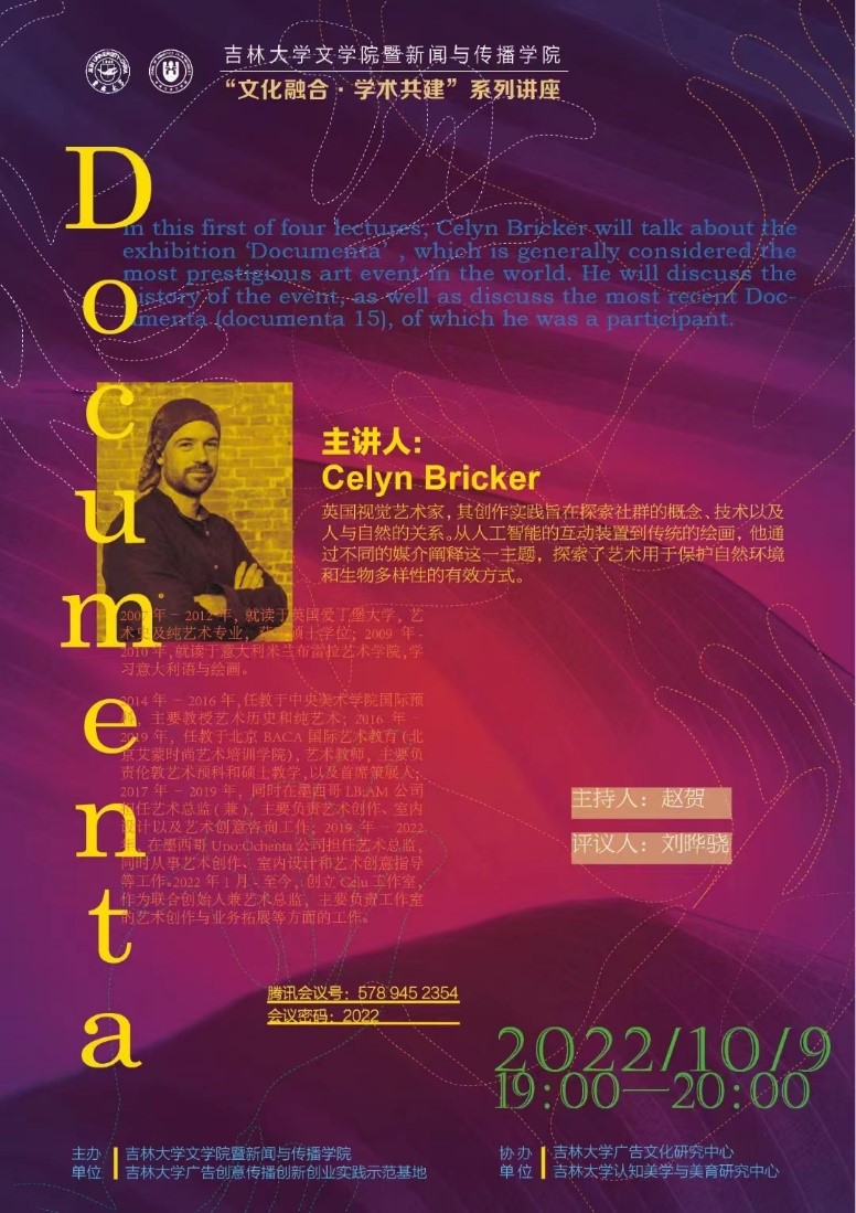 10月9日晚上19:00,由必赢(中国)biying·官方网页版暨新闻与传播学院、吉林大学广告创意传播创新创业实践示范基地主办,吉林大学广告文化研究中心和吉林大学认知美学与美育研究中心协办的“文化融合·学术共建”国际学术讲座活动邀请了英国视觉艺术家Celyn Bricker在线做了题为《卡塞尔文献展(Documenta)》的英文学术讲座。本次讲座以线上形式进行,由传播系国际传播教研室主任赵贺副教授主持,刘晔骁副教授评议。相关专业老师、在读本科生及硕士研究生共100余人参与了此次活动。