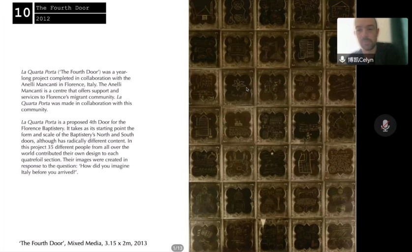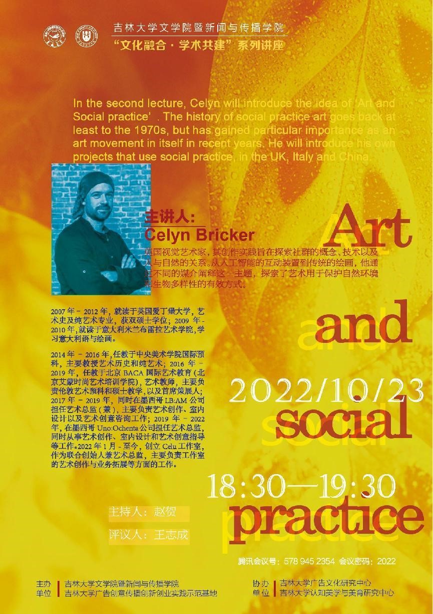 10月23日,由必赢(中国)biying·官方网页版暨新闻与传播学院、吉林大学广告创意传播创新创业实践基地主办,吉林大学广告文化研究中心和吉林大学认知美学与美育研究中心协办了第二期主题为“艺术和社会实践”的“文化融合·学术共建’’的英文学术讲座。本次讲座以线上形式进行,由传播系国际传播教研室主任赵贺副教授主持,创意传播设计教研室主任王志成老师评议。相关专业老师、在读本科生及硕士研究生共九十余人参与了此次活动。本期仍由英国视觉艺术家Celyn Bricker主讲。