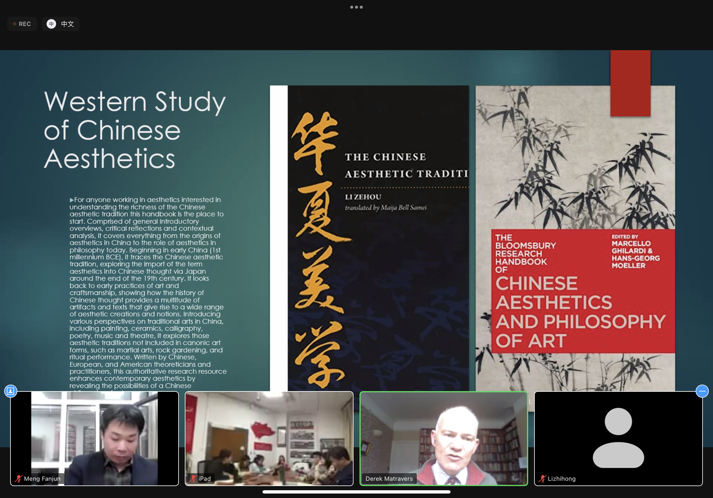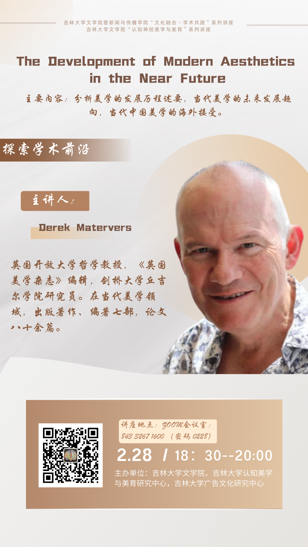2023年2月28日下午18:30,英国开放大学哲学教授Derek Matervers做客必赢(中国)biying·官方网页版暨新闻与传播学院,在线上举行了题为“The Development of Modern Aesthetics in the Near Future”的学术讲座。必赢(中国)biying·官方网页版副院长梁玉水教授致欢迎辞。李志宏教授、姜勇教授、张羽副教授参加讲座并与Derek教授进行了交流。学院硕士博士研究生共计三十余人聆听了讲座,其中2022级文艺学专业组织了集体学习,讲座还邀请了部分浙江大学博士研究生参加。认知美学与美育研究中心副主任孟凡君副教授主持了本次讲座。
