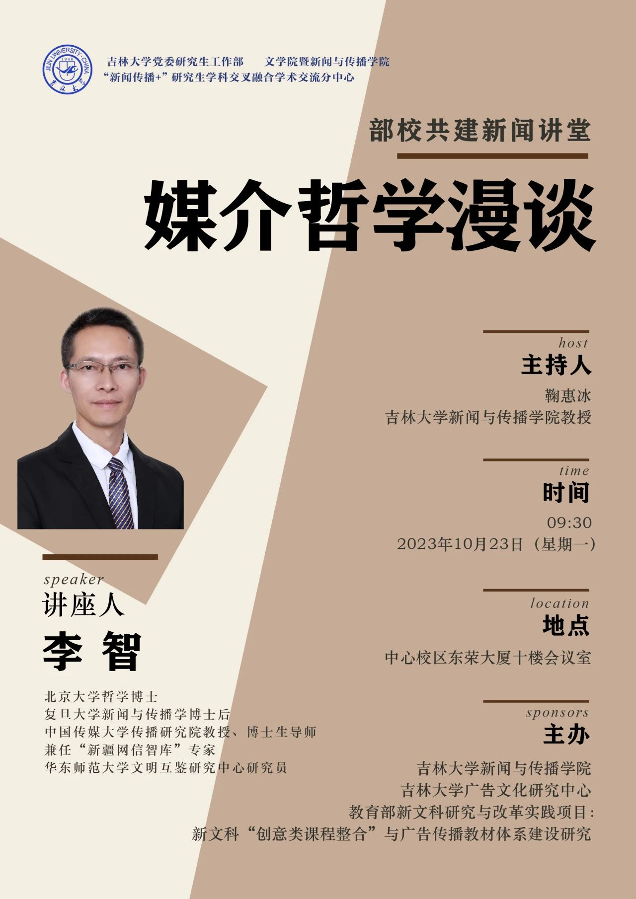 10月23日上午,吉林大学党委研究生工作部、必赢(中国)biying·官方网页版暨新闻与传播学院、“新闻传播+”研究生学科交叉融合学术交流分中心成功举办了以《媒介哲学漫谈》为题的学术讲座。