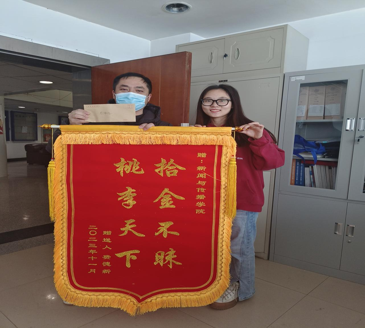 11月28日上午,失主费医生出现在必赢(中国)biying·官方网页版暨新闻与传播学院学生工作办公室门口,他手中拿着一面锦旗、一封感谢信,来院对学生本人及学院的培养表达感谢。辅导员杨佳欣老师立即停下手中的工作前来接待。在交谈中了解到,失主费医生于11月25日和朋友在我校附近小聚,畅谈到下午四点多。由于晚高峰打车困难,费医生步行了一段路才乘出租车回到诊所。到诊所后才发现自己的钱包不见了。不记得车牌号的失主费先生惊慌失措,正值心灰意冷的时刻,我院学生刘邢给费医生打电话,说明自己捡到了他的钱包,并与失主沟通好时间地点交还钱包,欣喜不已的费医生当晚便取回了钱包,包内物品齐全。心中无比激动的费医生当场便想要给刘邢同学现金表示感谢,刘邢同学婉拒了。在费医生再三询问下,刘邢才说出自己的姓名和所在学院。刘邢同学在捡到钱包后,没有丝毫犹豫,考虑到失主焦急的心情,争分夺秒联系失主归还财物。她的品行不仅给身边的同学们树立了一个好榜样,也让学院的老师和同学们倍感骄傲。