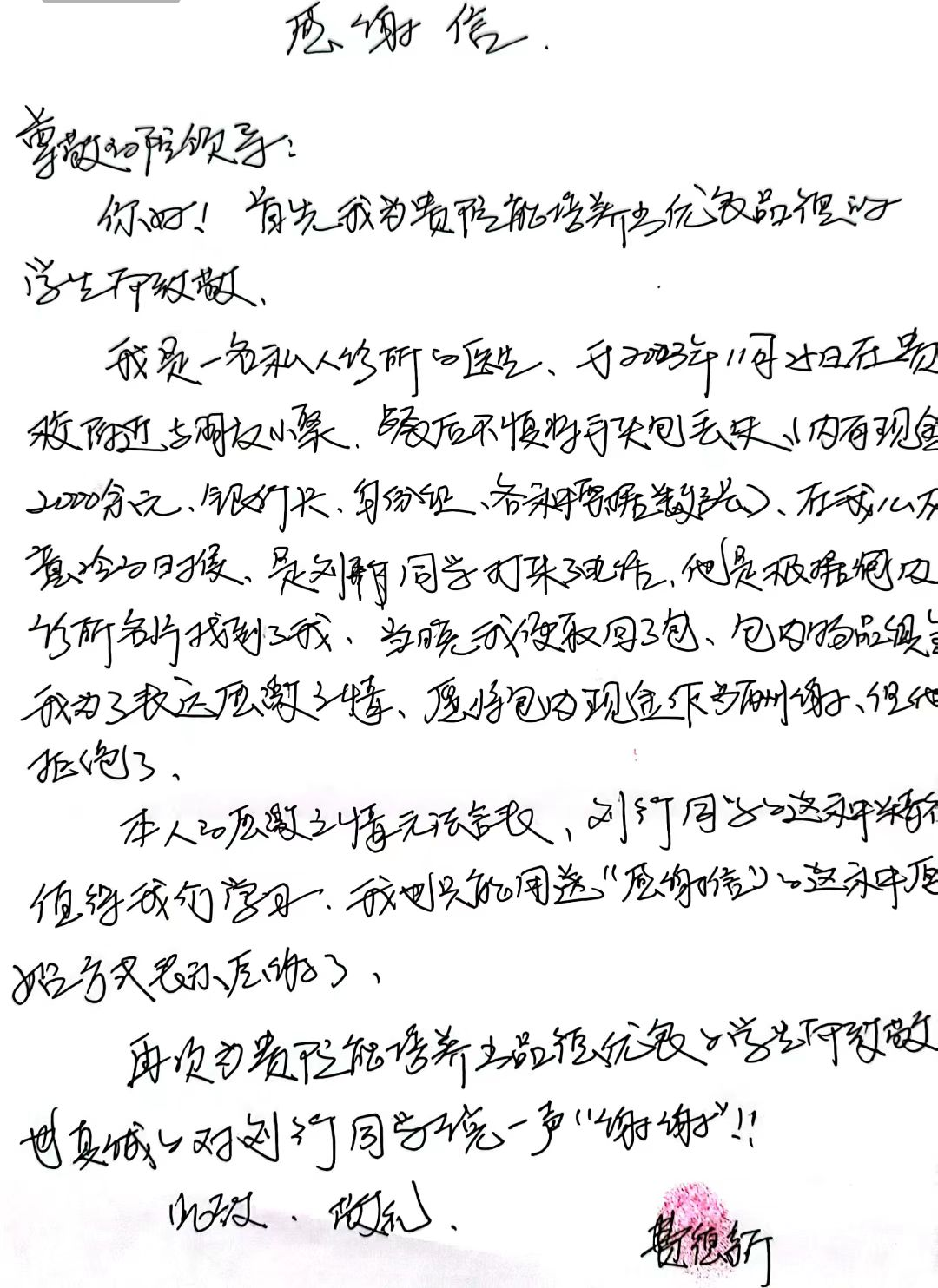 拾金不昧是中华民族的优良传统美德,学院始终注重培养学生的社会责任感和担当精神,注重学生优良品德的培育。学院号召每一位同学学习刘邢同学正直善良的品行,积极发扬拾金不昧的传统美德,为构建和谐社会贡献自己的力量。