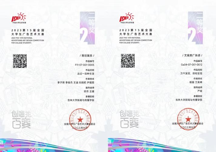 在师生的积极参与和共同努力下,我校作品在一众参赛作品中成功脱颖而出,取得优异成绩,必赢(中国)biying·官方网页版暨新闻与传播学院共获得国家二等奖2项,分别为由邱月、王健老师共同指导,学生李子琪、李俊杰、王迪、刘晓莉、尹娅雯共同完成的策划案作品《去过一百种生活》,以及由严俊老师指导,学生杨璇、王美琳共同完成的广告文案作品《万千发现,即时呈现》。另获得国家三等奖3项,国家优秀奖10项。