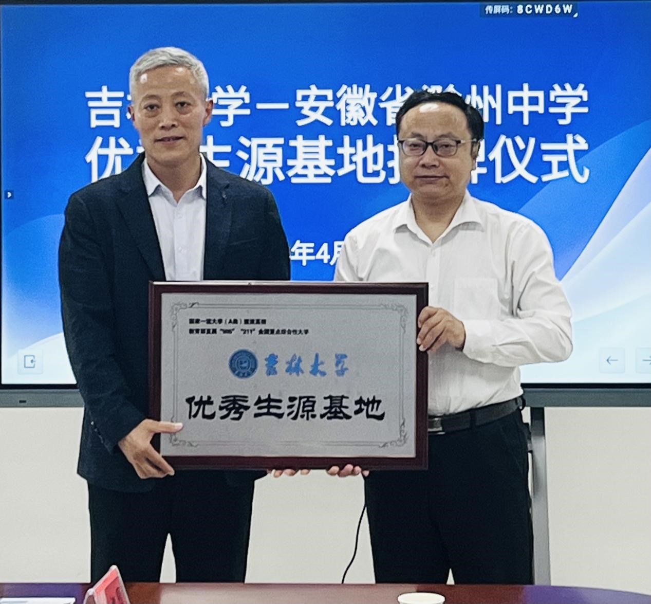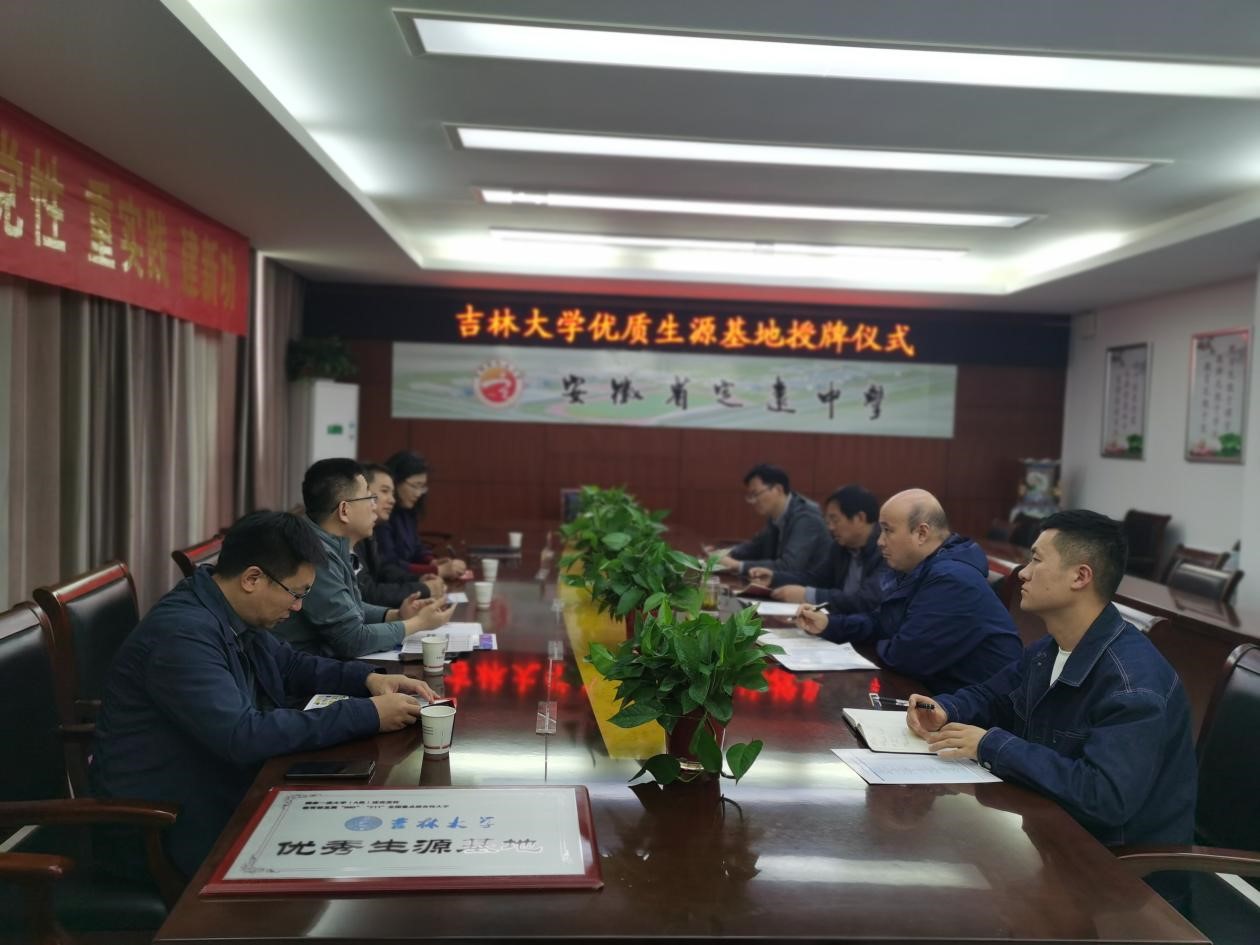 座谈后李静代表吉林大学向定远中学授予了优秀生源基地牌匾。