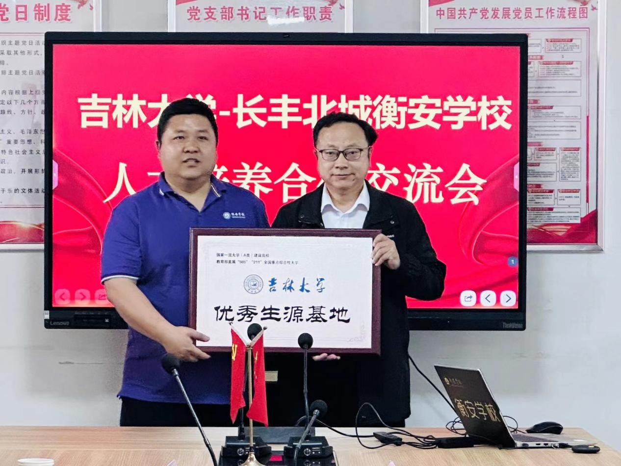4月16日,马卫东副院长一行来到了安徽省长丰北城衡安学校。衡安学校依托衡水中学,是一所民办公助全日制寄宿制完全中学。招生宣讲组同何洪涛校长、刘军飞副校长和高中部教师进行了座谈。马卫东副院长代表吉林大学为衡安学校授予优秀生源基地牌匾。