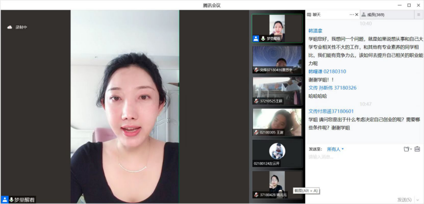 首先,伊彦学姐按照时间顺序,向大家介绍她毕业后一路走来,从在深圳开始第一份工作;到重拾新闻专业,跳槽至相关国企负责全国市场拓展工作;再到即将升任至最高管理层,遭遇事业“瓶颈期”后,不甘于现状,选择“为自己工作”,去北京创业并获得初步成果的整个过程。学姐的经历、心路历程、自我反思等等为同学们描绘了一个在校园中看不见的职场世界。接着,伊彦学姐从简历、自我评估、职场中的注意事项三个方面为即将成为“职场新人”的同学们提出建议。最后是互动环节,同学们激烈讨论,纷纷提出自己的问题,希望伊彦学姐提出她的建议和看法。问题包括:怎样更好地适应由大学到职场的环境转变、在学业和工作上的取舍问题、职业选择问题、创业相关问题等等。学姐结合自己的经验和体悟一一为大家耐心解答,并对大家提出作为学姐的殷切嘱托。