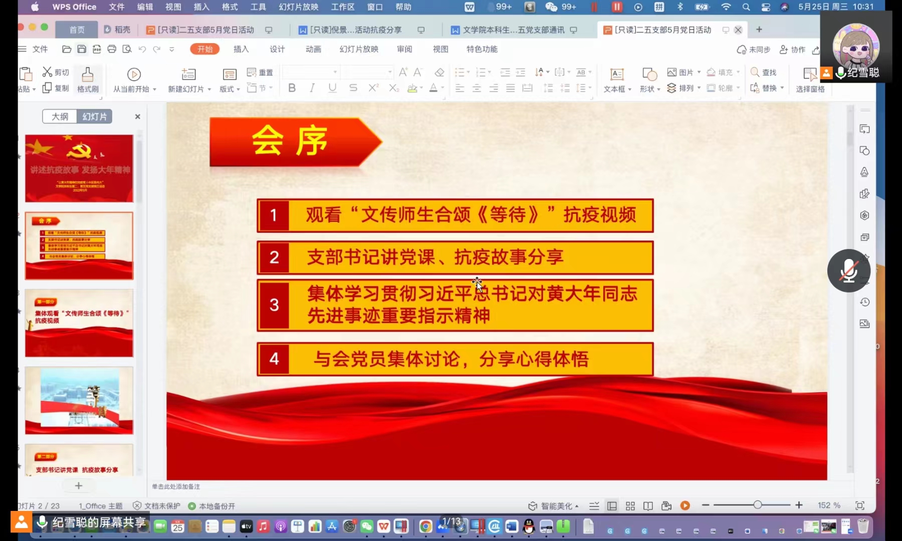 在过去的两年里,中国共产党团结带领全国各族人民,进行了一场惊心动魄的抗疫大战,经受了一场艰苦卓绝的历史大考,取得了抗击新冠肺炎疫情斗争的重大战略成果,创造了人类同疾病斗争史上的又一个英勇壮举。正是在这场殊死较量中,中国人民和中华民族谱写了一段可歌可泣的抗疫史诗,铸就了“生命至上、举国同心、舍生忘死、尊重科学、命运与共”的伟大抗疫精神。对此,按照学校要求,必赢(中国)biying·官方网页版本科生第二、第五党支部于2022年5月25日上午10:30在腾讯会议开展“讲述抗疫故事,发扬大年精神”主题党日活动。会议由第二党支部书记曲昭琦和第五党支部书记王振彰组织召开,支部全体党员、2022年第一期新闻与传播学院发展对象参加会议。