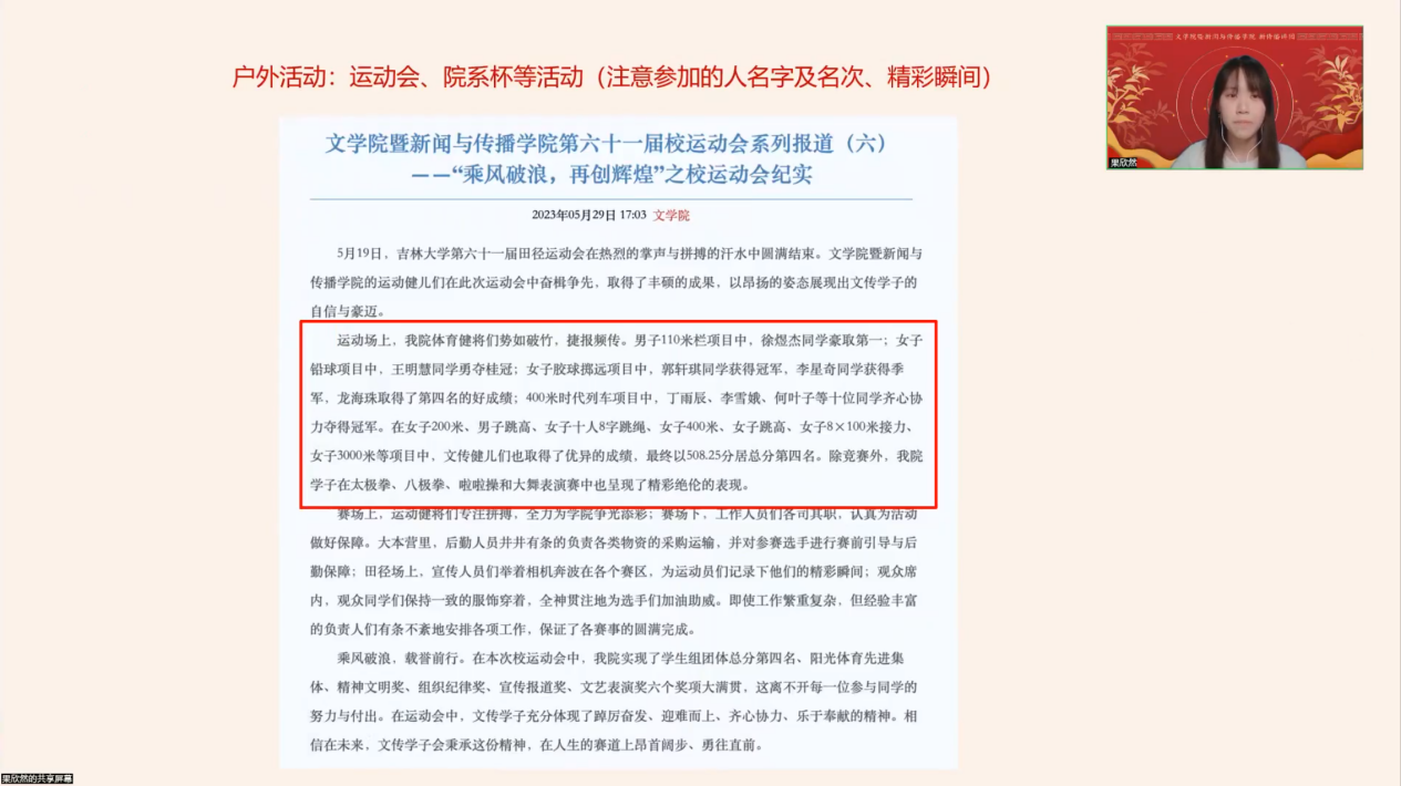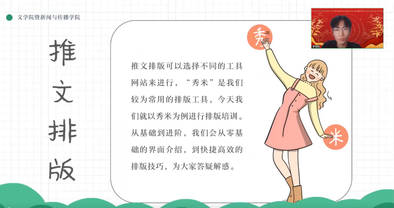 为丰富学生寒假生活,提升实践能力,1月20日至27日,必赢(中国)biying·官方网页版暨新闻与传播学院新传播讲团创新推出“讲团小春晚”线上培训活动。本次活动以腾讯会议为平台,面向学院各年级学生开展八场专题课程,内容涵盖秀米排版、会议摄影、新闻报道、数据分析等实用技能,吸引近五百人次参与,为文传学子搭建了寒假充电的“云端课堂”。