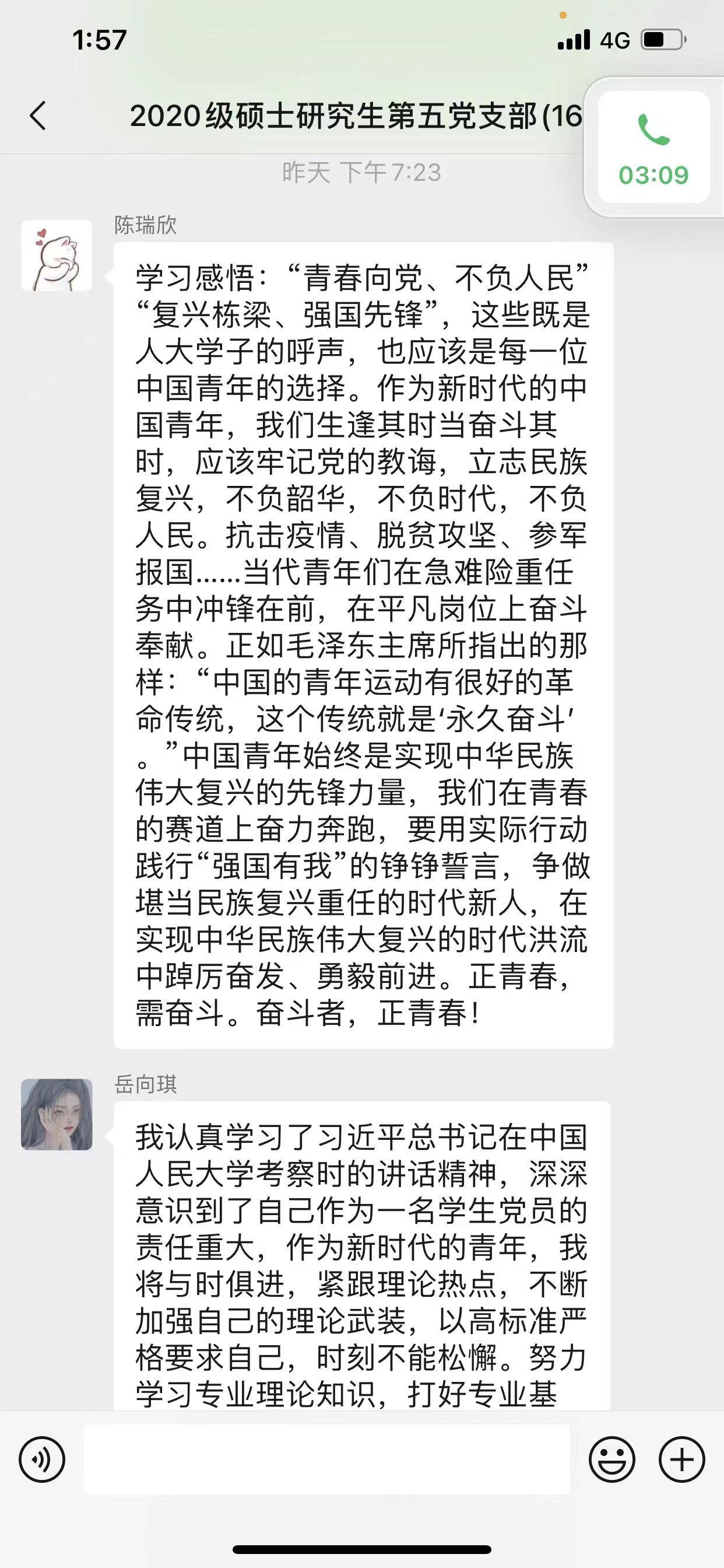 2022年5月4日,必赢(中国)biying·官方网页版硕士研究生各党支部线上开展“弘扬五四精神”主题活动,全体党员和团员共同学习习近平总书记在中国人民大学考察时的重要讲话精神并共同观看红色电影,起到了激励和引导广大学生党员和团员进一步弘扬〝爱国、进步、民主、科学”的五四精神的作用,极大地增强全体党员和团员同志的社会责任感和历史使命感。