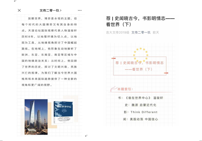 本组周推荐通过“一书、一史、一闻、一影”四个与同学专业相关的角度出发,深入探讨当今国际关系和世界局势,在书目介绍环节通过对《谁在世界中心》以及《看世界》两本著作的介绍,带领大家走近世界热点话题,深入了解当今世界不断变化的国际关系,从多个角度分析中国的崛起与腾飞之路,旨在让同学们在疫情期间增强国际视野,对世界有着进一步的认识。电影和新闻推荐环节,通过中美关系、美股变化等多个近期热点事件让同学们认识到中国发展面临的机遇和挑战吗,在历史部分结合“看世界”主题分享历史与现实相结合的内容。
