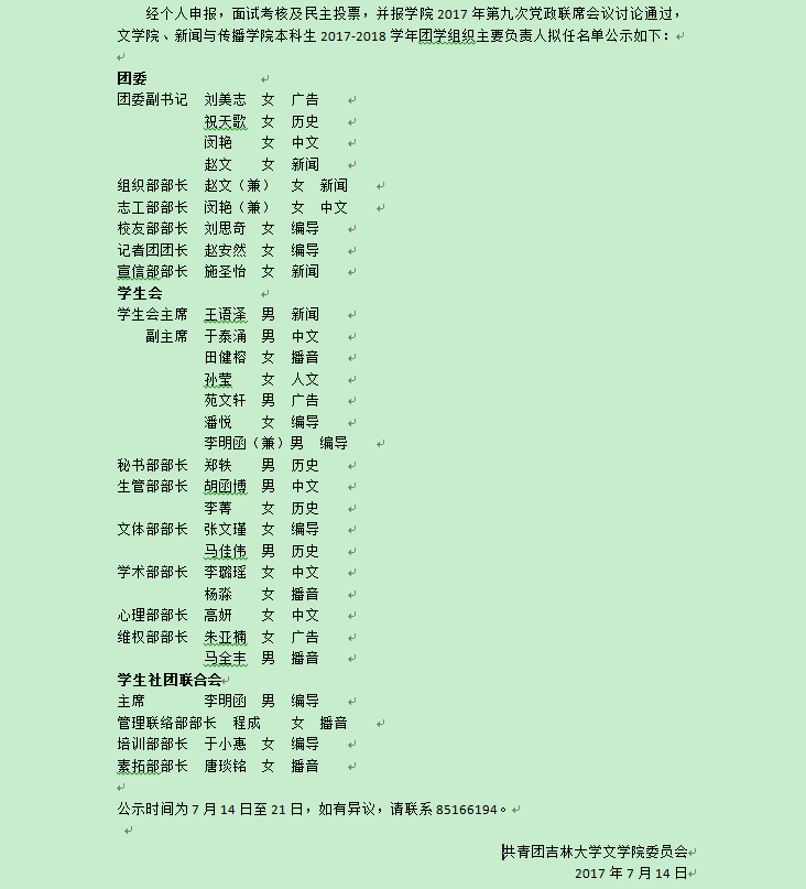 必赢(中国)biying·官方网页版、新闻与传播学院2017-2018学年本科生团学组织主要负责人拟任名单公示